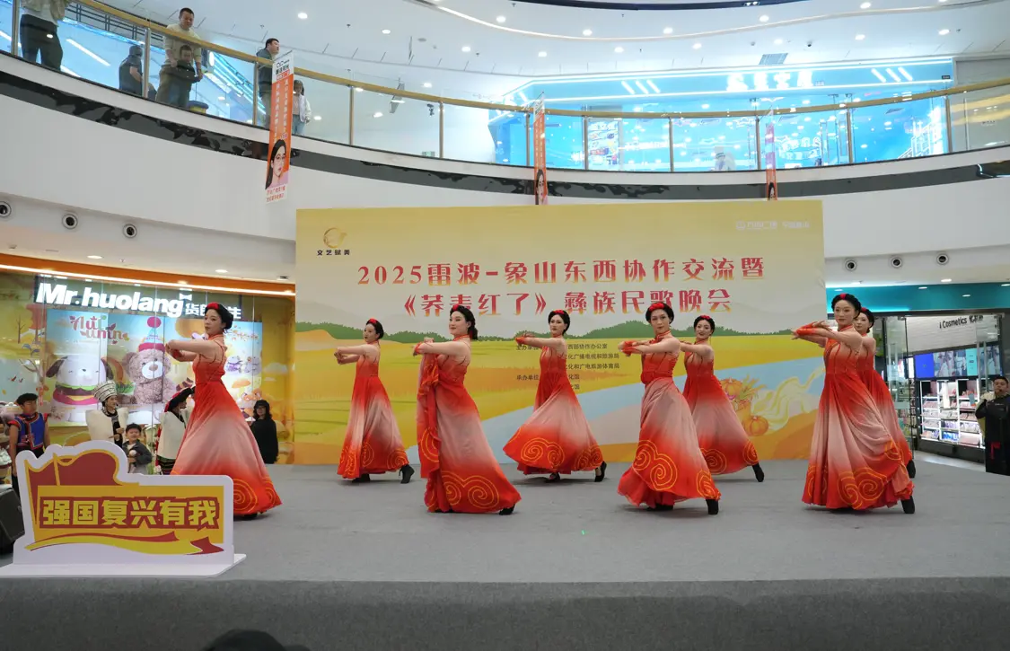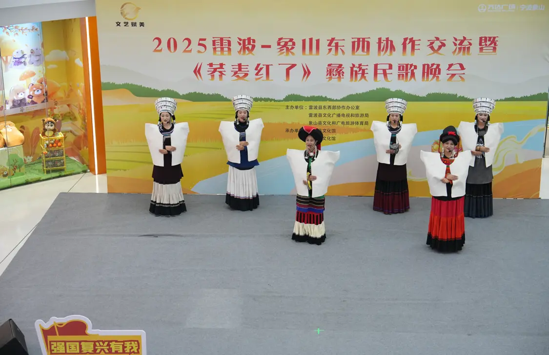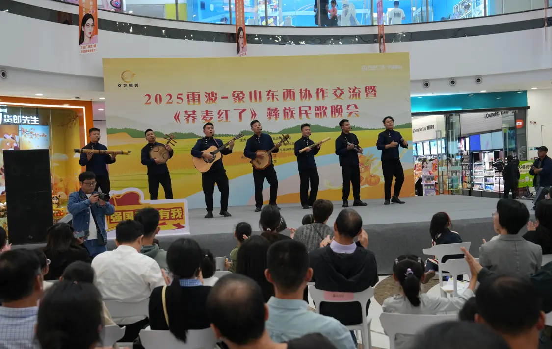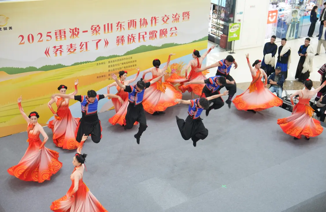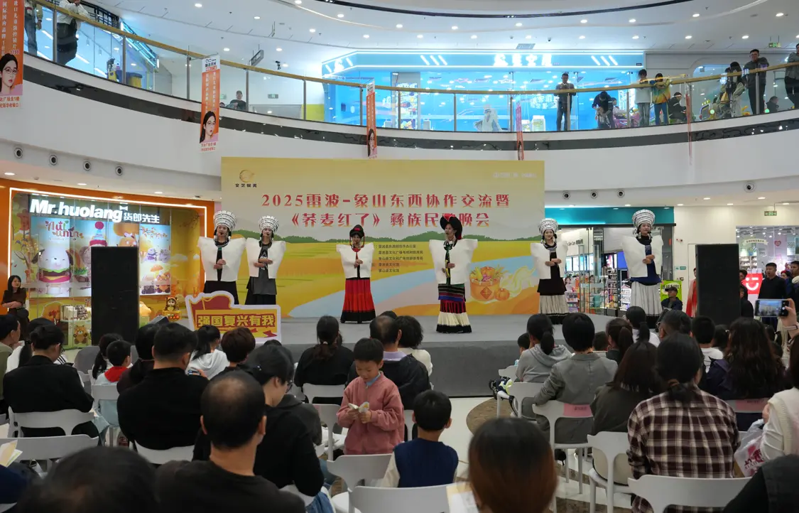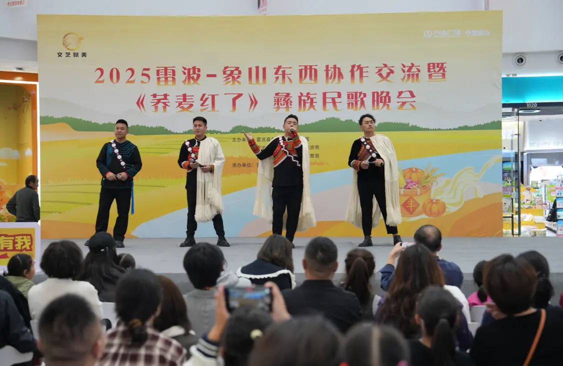 10月31日晚,象山万达广场一楼大厅人头攒动,“山海情深,文化传情”雷波县 2025年东西协作文化交流展演活动在此拉开帷幕。首场《荞麦红了》彝族民歌晚会吸引数百名市民驻足观看,原生态的民族旋律与灵动舞姿,奏响了两地文化共融的动人乐章。